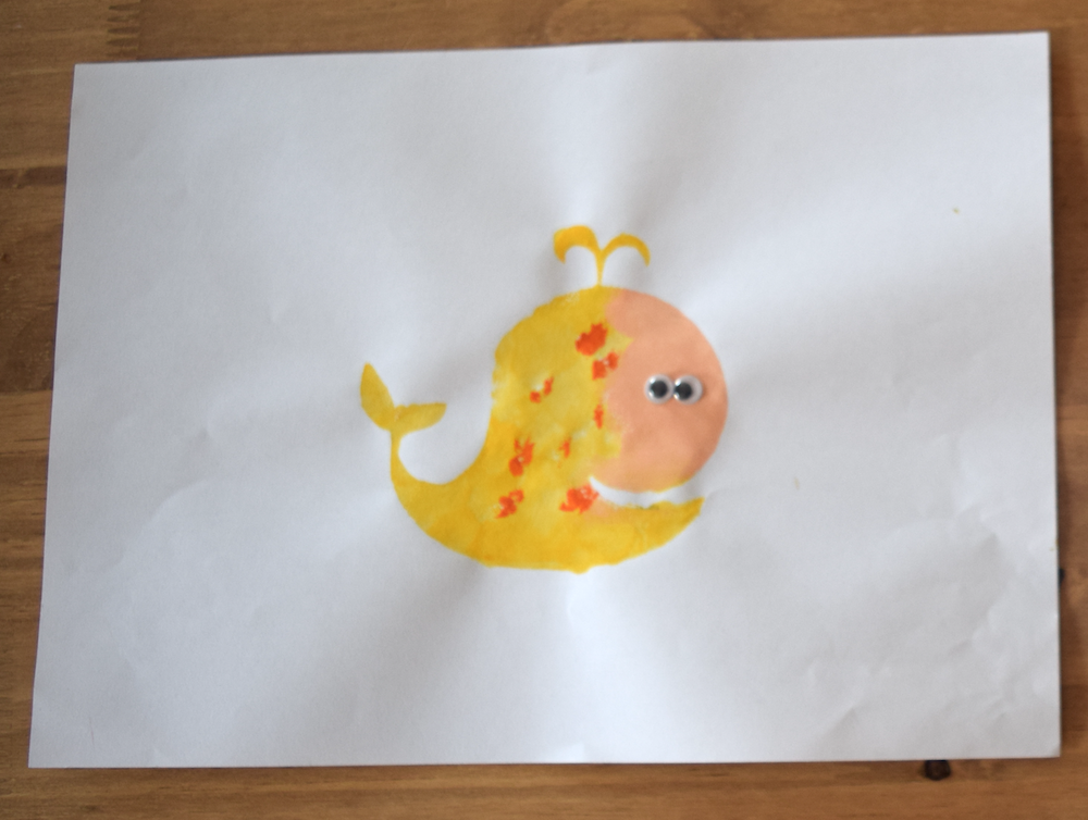 Outro animal que Isabela criou foi peixe! Dois peixes! Nós lemos o livro “O Peixinho Agitado” e foi fazer os peixes. Também foram feitos com prato descartável. Ela pintou com tinta guache, usou esses olhos com adesivo (são ótimos, comprei no AliExpress), também usou cola colorida para a boca e fez uma boca diferente com cotonete. Ficaram uma graça.