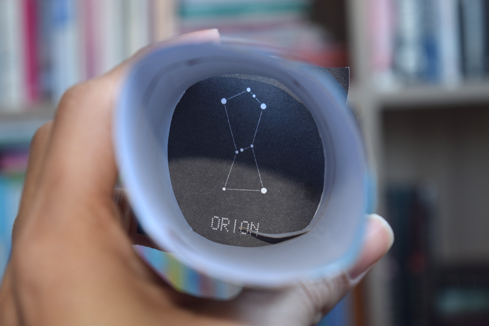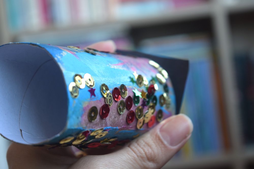 Isabela está louca por um telescópio, sério, então resolvi criarmos um telescópio de brinquedo. Ela pintou um rolo de papel higiênico e depois colou lantejoulas nele. E para ver as estrelas eu imprimi um kit com constelações daqui é do site web.kidsactivitiesblog.com. Ela adorou!