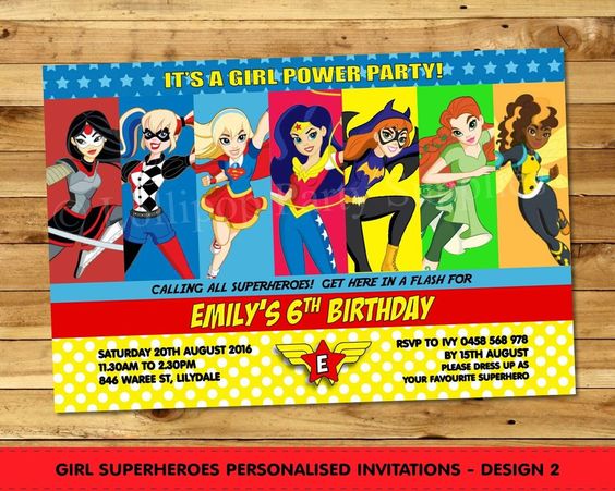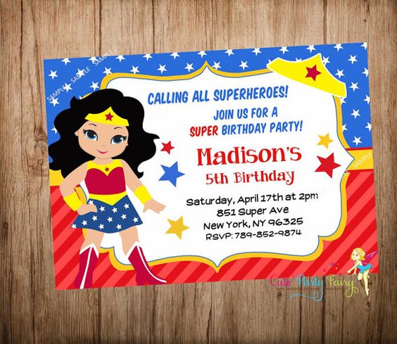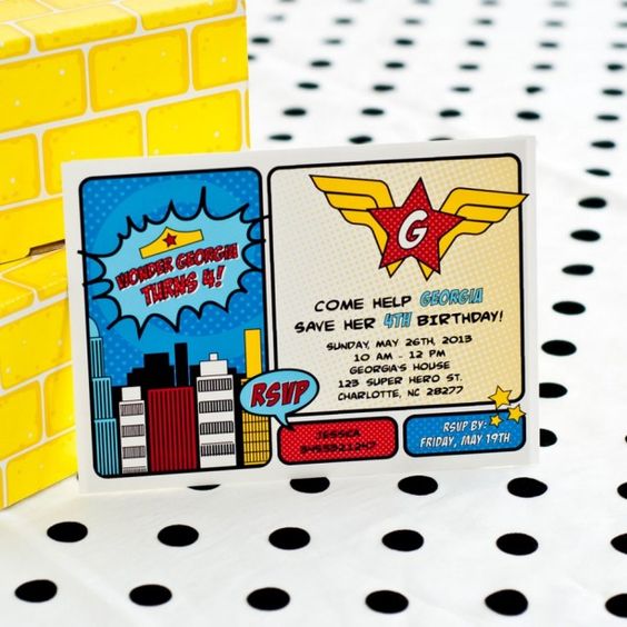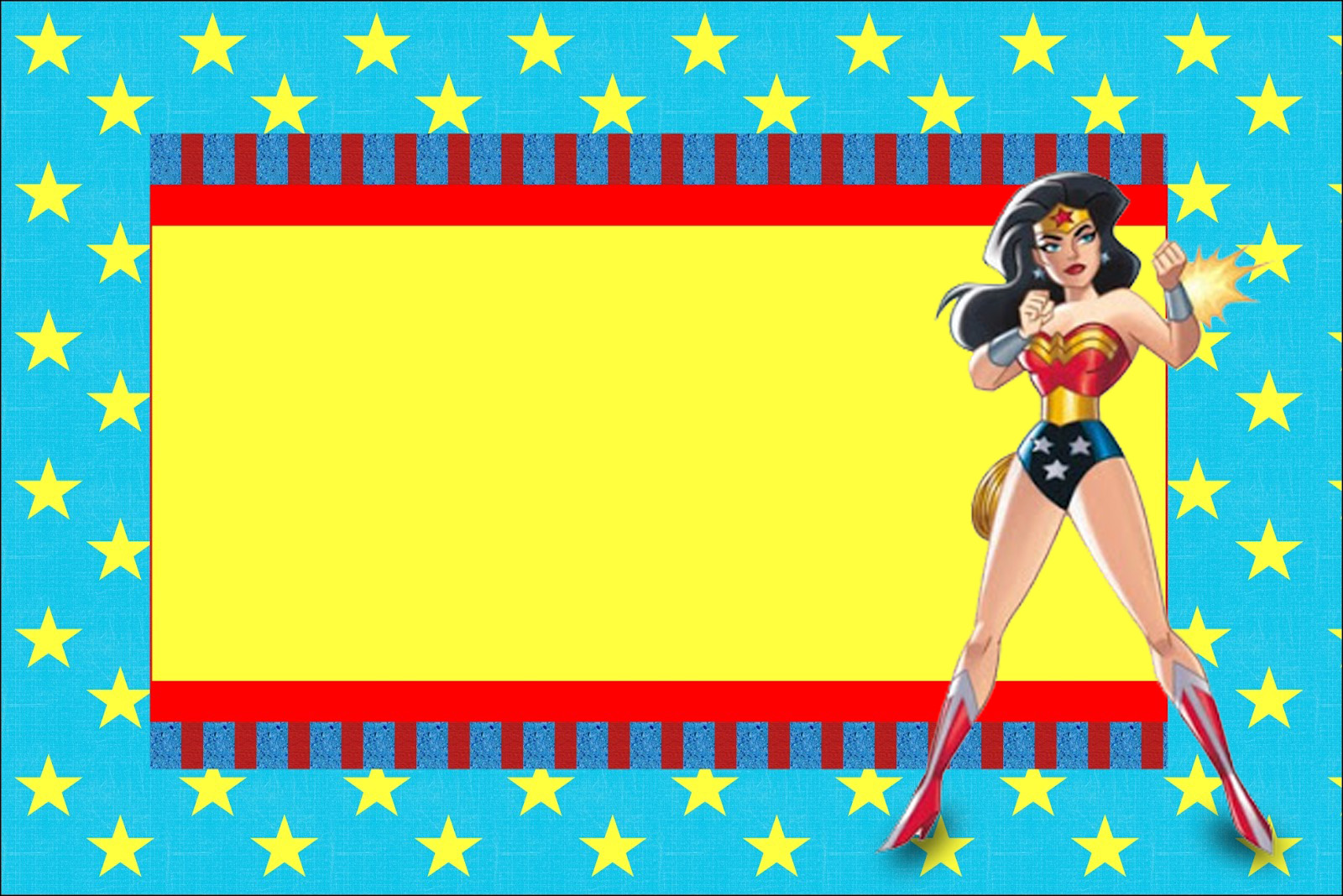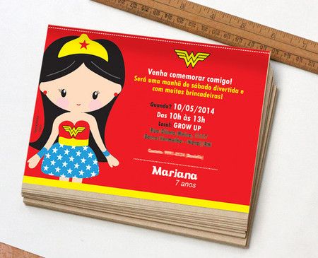 Os convites não poderiam deixar de ser temáticos, e também podem incluir outros heróis como o Superman ou o Batman. Só tente não colocar herois que não fazem parte do mesmo universo da Mulher-Maravilha como o Thor ou o Homem de Ferro.