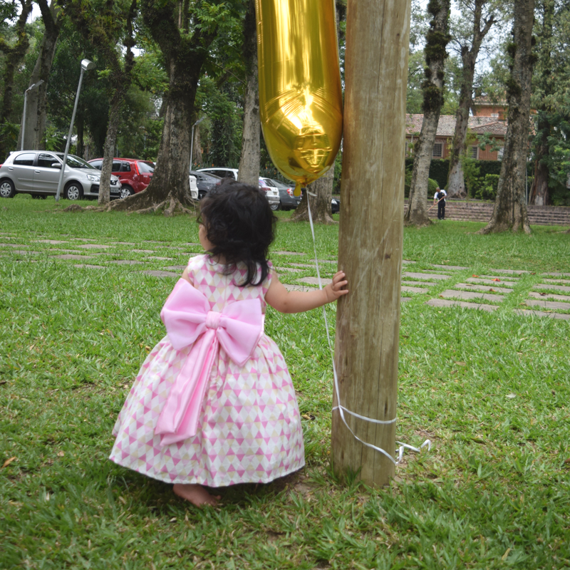 O vestido que minha pequena usou foi esse, rosa com amarelo e branco, lindo de viver. Ele é da loja Ana Giovanna. Olha o detalhe do laço atrás que coisa mais linda e esse volume, adoro!