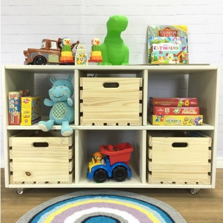 Eu adoro usar caixotes para as coisas das crianças. Uma ideia é usar o caixote com alguns livros, minhas filhas tem uma estante cheia de livros infantis por isso eu separo alguns e deixo no caixote na sala ou no quarto, deixo livros para 1 semana, lemos todos depois troco os livros, percebi que poucos livros nos caixotes despertam mais interesse nas meninas do que procurar os livros em uma estante cheia. Outra forma de usar os caixotes é para colocar pelúcias ou bonecas (coisas que ocupam bastante espaço né? Outra dica que gosto bastante é usar ele como o “caixote de histórias”, você escolhe um livro e pega (ou faz) coisas referentes aquela história, por exemplo, temos um livro sobre o “o almoço do coelhinho” separei um coelho de pelúcia e itens (de verdade) que o coelho da história gosta de comer (cenoura, aipo e batata).