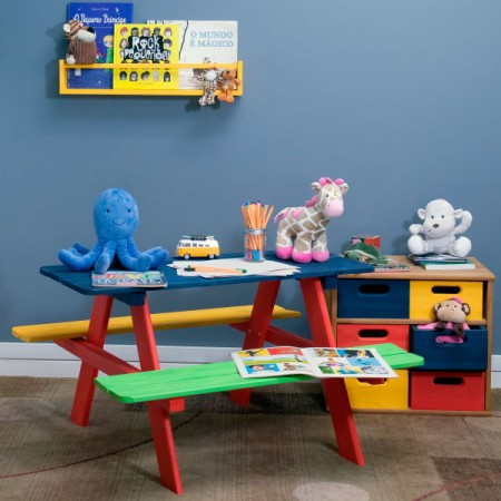 Esse é um móvel que pode ficar no quarto ou na sala, como você preferir, mas é importante que a criança tenha uma mesa e uma cadeira para o seu tamanho. Onde ela possa ter autonomia para sentar e levantar sem precisar de ajuda, possa fazer seus lanches e suas atividades com liberdade.
