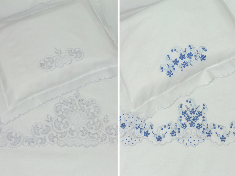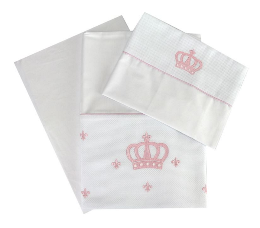 Na Xique Xique tem vários modelos de jogos de lençol, vários bordados, tanto com coroa rosa ou azul como richelieu, que também tem disponível em outras cores como azul, branco e bege.