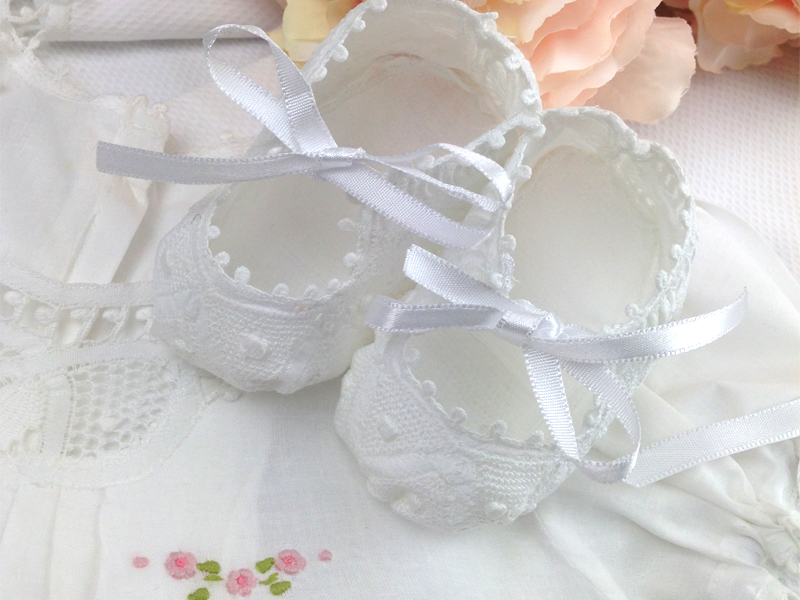 1 – Pano de boca com porta chupeta 2 – Calcinhas 3 – Sapatinhos de bebê de Renda Renascença