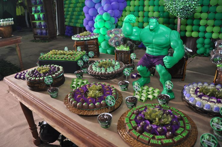 As crianças sempre tem um personagem preferido, né? Você pode conversar com seu filho e definir se a festa será sobre todos os Vingadores, ou um só! Olha essa explosão de verde!