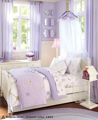 Aplicar a cor lilás usando a referência de flores é super feminino, como é o caso da aplicação na parede deste quarto. A janela tem um tom roxo para contrapor com a parede lilás, que dá um charme à mais e exemplifica o que comentei sobre as variações das cores entre o roxo e o lilás.